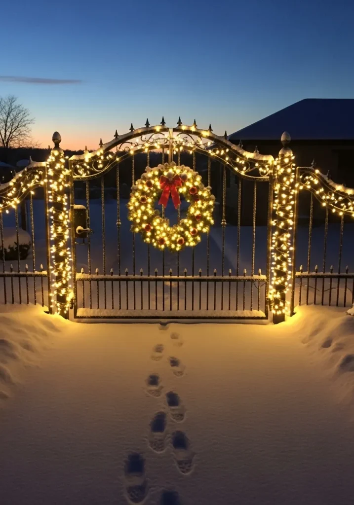 This charming winter scene turns a simple iron gate into a glowing holiday welcome. The black metal bars are wrapped in strands of warm fairy lights that shimmer like gold against the deep blue evening sky. A lush wreath, trimmed with red ornaments and a bold velvet bow, hangs proudly at the center, radiating cheer through the quiet snow. The soft footprints leading up to the gate make the whole setup feel like a Christmas story waiting to unfold.