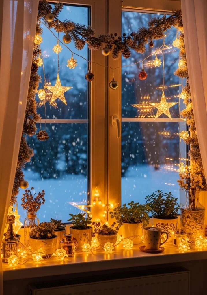 This cozy window nook is a glowing little dream. Frosted pine garlands trace the frame, dotted with ornaments and softly lit fairy lights that shimmer like tiny fireflies. Star-shaped lights dangle across the glass, catching the reflection of falling snow outside, while small potted plants and delicate dried florals line the sill in warm companionship. A steaming mug, amber glass bottles, and a sprinkle of golden twinkle lights complete the scene, turning an ordinary window into a postcard-worthy Christmas moment.