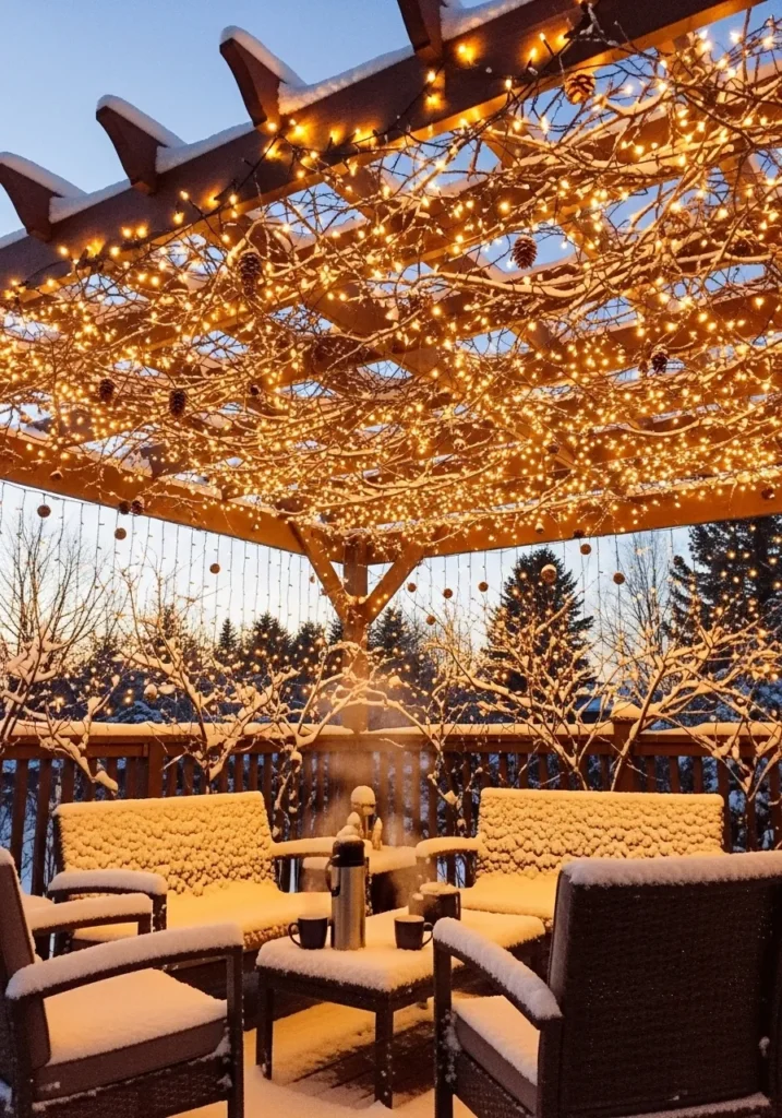 This cozy outdoor setup turns a simple winter patio into pure magic. A wooden pergola is draped in twinkling fairy lights that wrap around frosted vines and pinecones, creating a glowing canopy against the soft evening sky. Snow blankets the wicker chairs and table, with a steaming thermos waiting in the middle like an open invitation to pause and enjoy the hush of winter. The entire space feels like a hidden nook straight out of a Christmas postcard, glowing softly amid the cold.