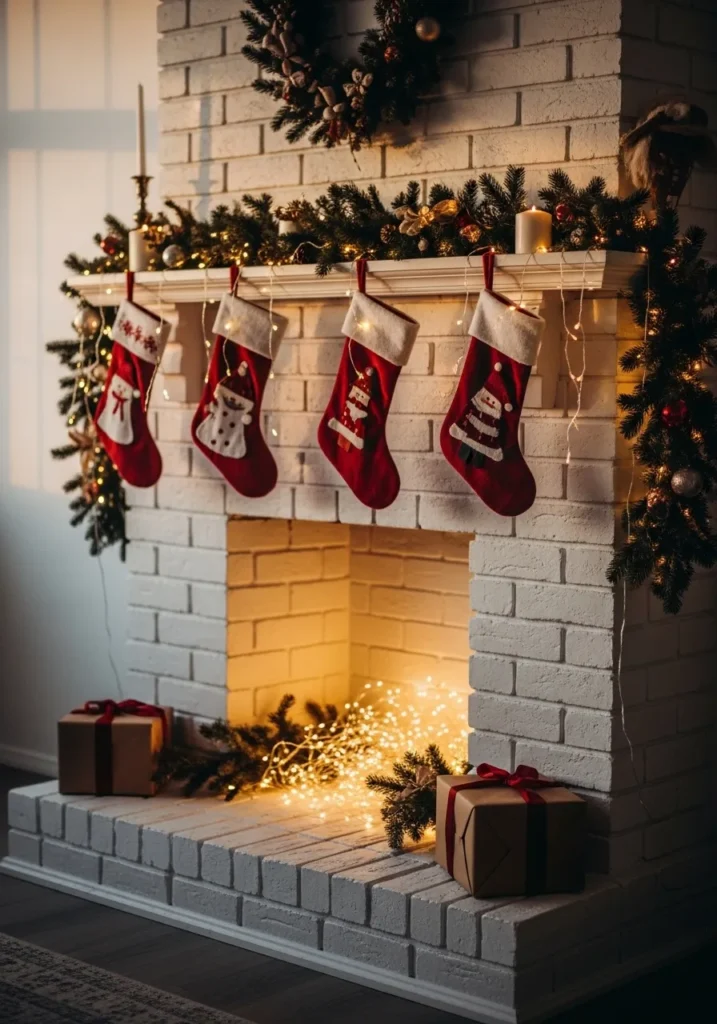 This beautiful living room scene centers around a white brick fireplace dressed up for Christmas with red stockings, lush garlands, and a sprinkle of fairy light magic. The soft golden lights tucked inside the hearth give the illusion of a gentle, glowing fire, while pine branches and wrapped gifts add that perfect festive touch. The balance of white, red, and green creates a timeless holiday palette that feels both cozy and classic.