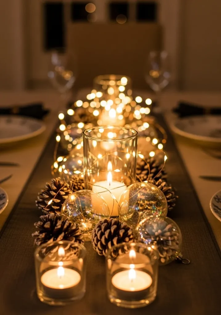 This table setup feels like stepping into a cozy Christmas dream. A soft trail of golden fairy lights winds around flickering candles in glass holders, creating that irresistible glow that makes everything feel more intimate and inviting. Frosted pinecones and delicate glass ornaments catch the warm light beautifully, adding subtle shimmer without overpowering the scene. The neutral palette keeps it elegant and timeless, perfect for a dinner that feels both festive and peaceful.