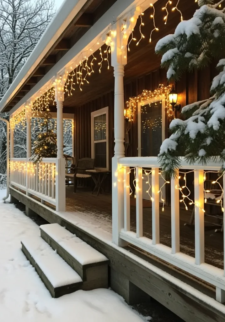 I absolutely adore this look because it feels both magical and inviting. There’s something so heartwarming about twinkling lights reflecting on fresh snow—it makes me imagine guests arriving to laughter and cocoa inside. I love how the contrast of warm fairy lights against the cool dusk creates that picture-perfect “Christmas card” glow that never fails to melt my heart.