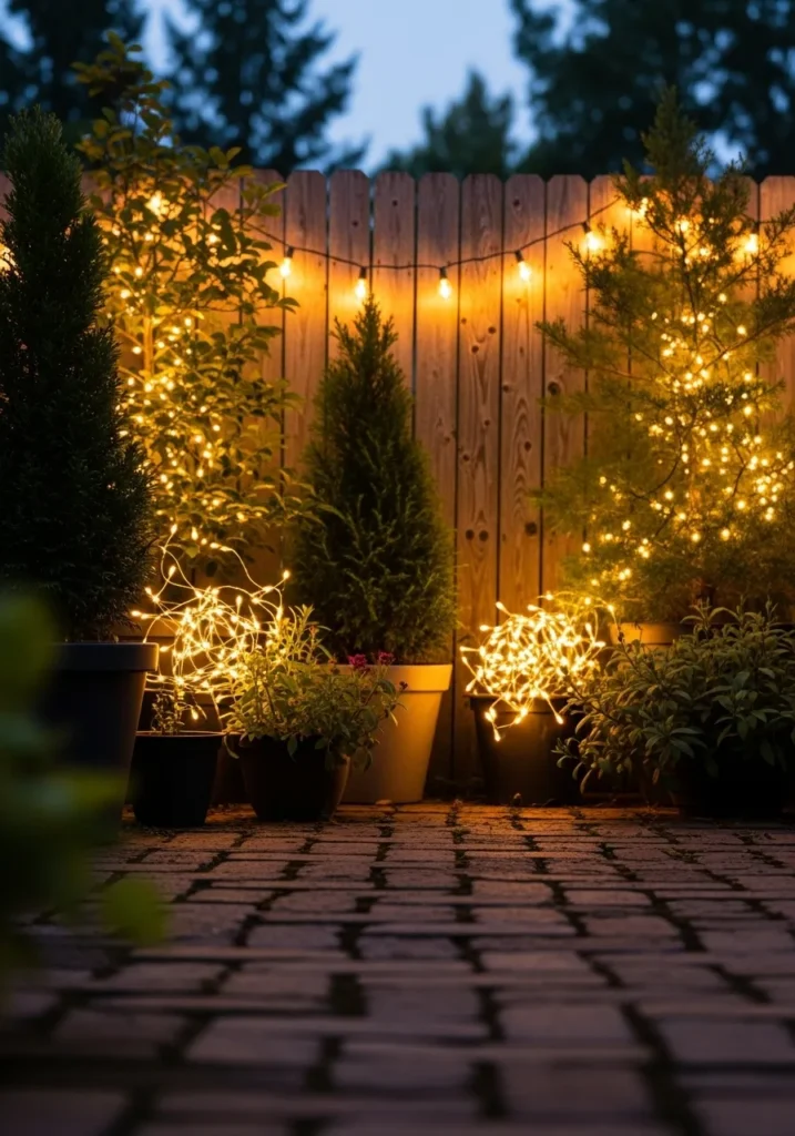 This cozy little garden corner feels like it’s straight out of a fairytale. The soft golden fairy lights wrap around the small evergreens and potted plants, creating a warm shimmer against the wooden fence. The gentle brick path draws the eye inward, while the string lights above add that perfect touch of festive charm. It’s simple, natural, and impossibly inviting, especially as the evening sky deepens.