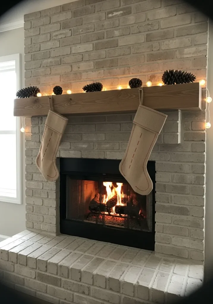 This brick fireplace has that effortless farmhouse look that never goes out of style. A simple wooden beam mantle holds pinecones and string lights that glow gently across the space. Two neutral stockings hang beneath, their soft tones blending perfectly with the rustic brick.