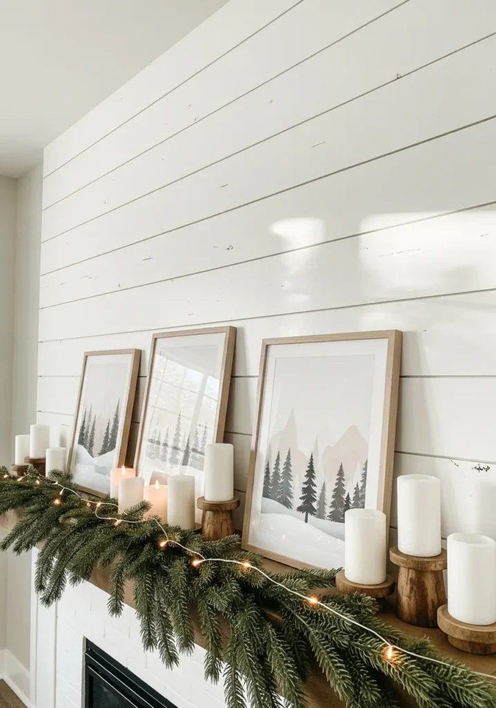 This farmhouse mantle keeps things simple but stunning. The shiplap wall makes the perfect backdrop for three mountain forest prints framed in light wood. A full garland of evergreens drapes across the wooden shelf, paired with chunky candles of varying heights for a warm, inviting glow. Tiny string lights add a delicate sparkle that ties the whole look together.