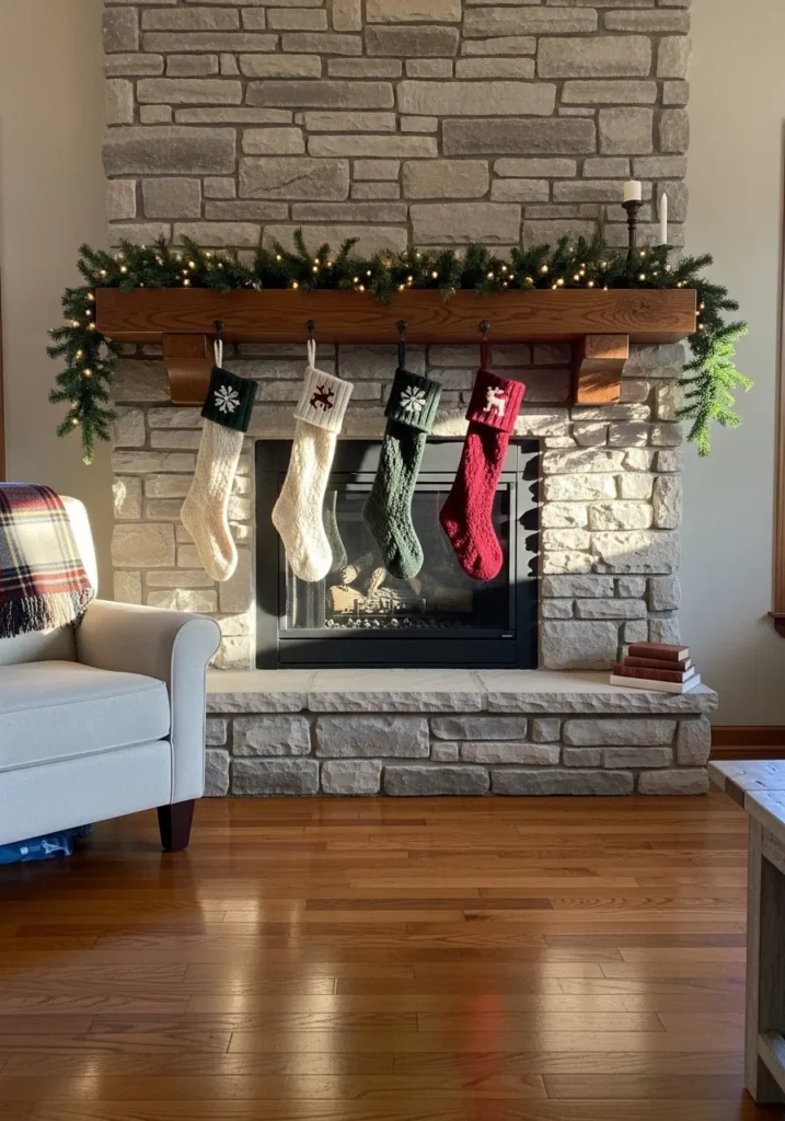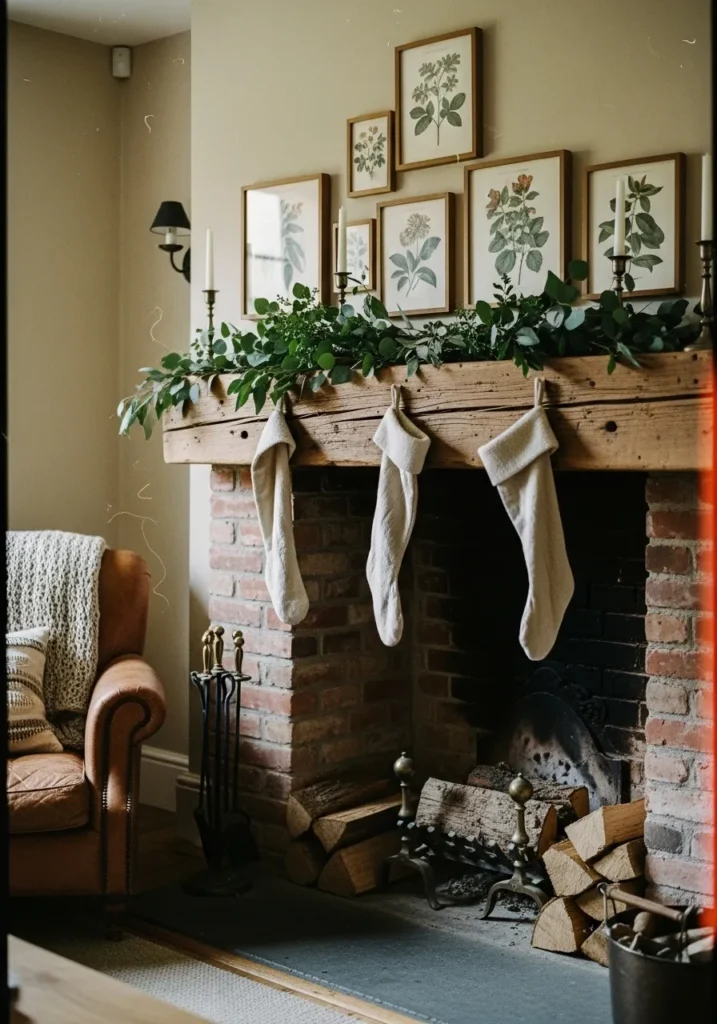 This setup is all about understated elegance. The natural wooden mantle holds a lush eucalyptus wreath and a row of cozy knit stockings hanging neatly below. The warm candlelight brings a soft glow across the wall, highlighting the organic shapes of the greenery. It’s minimalist yet filled with personality, proving that simplicity can still feel incredibly festive.