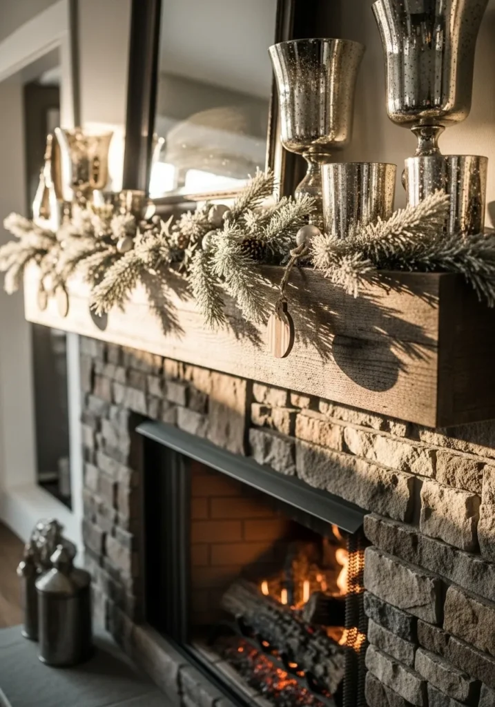 This farmhouse mantle takes a more elegant turn while still keeping that rustic heart. A frosted evergreen garland weaves across the wooden beam, paired with metallic candleholders that shimmer softly in the light. The combination of silver accents and natural wood gives the space a refined yet cozy look that feels special for the season.