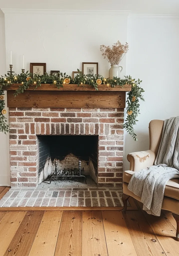 This brick fireplace feels fresh and cheerful with its greenery garland accented by slices of dried oranges. Small brass candlesticks, soft fairy lights, and framed vintage prints bring a nostalgic, handmade charm. The natural tones of wood, brick, and citrus make the space feel warm and full of life.