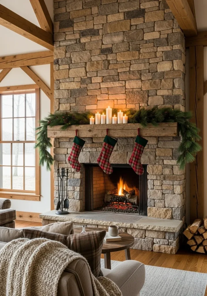 This rustic stone fireplace feels straight out of a mountain cabin. The thick wooden mantle is dressed with a full pine garland and a collection of glowing candles, creating the perfect soft light against the natural stone. Three plaid stockings hang neatly, bringing that classic red-and-green farmhouse charm to the space. The cozy plaid pillows and chunky knit throw tie the whole look together beautifully.