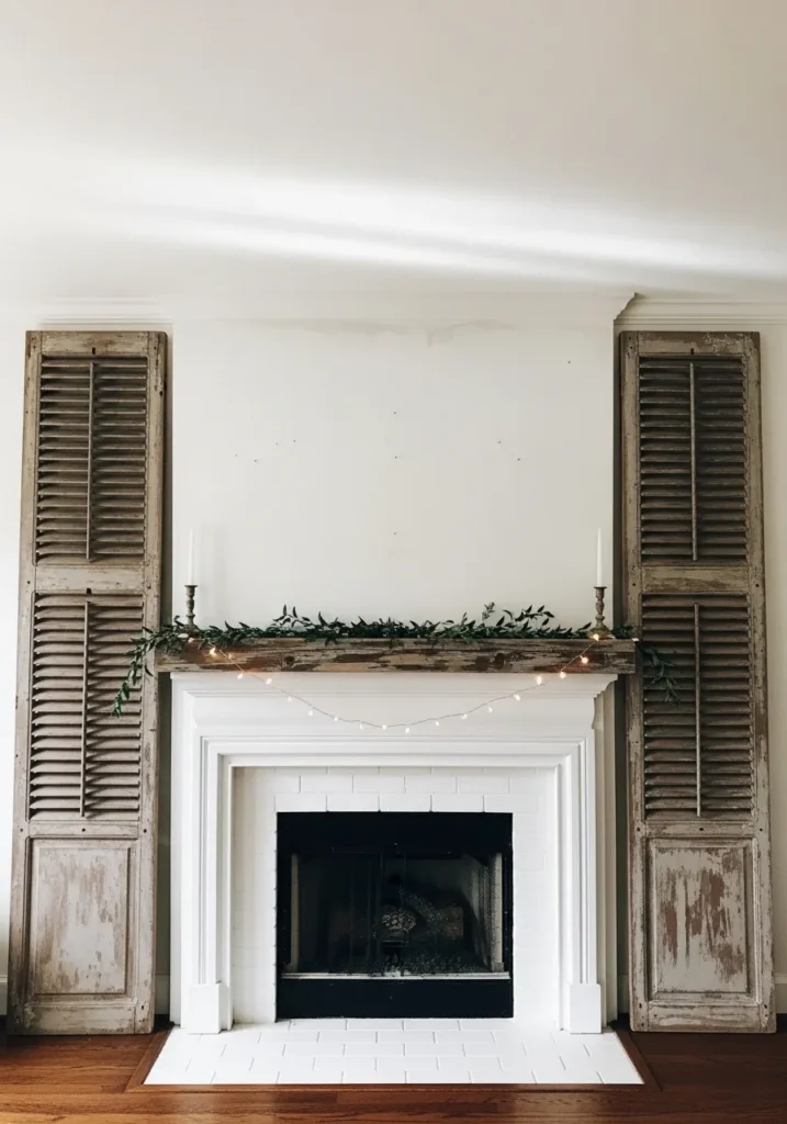 This look captures that vintage farmhouse charm so effortlessly. The white fireplace is framed by two tall, weathered shutters that add instant character. A simple garland of greenery sits along the rustic wooden mantle, with delicate string lights adding a soft festive glow. The tall brass candlesticks bring just the right touch of elegance.