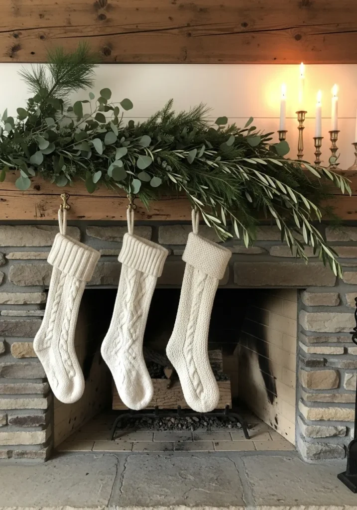 This mantle captures the beauty of nature in the simplest way. Layers of eucalyptus, pine, and olive branches spill gracefully over a wooden beam, with brass candleholders glowing softly in the background. Three chunky knit stockings in creamy white hang neatly below, adding texture and warmth.