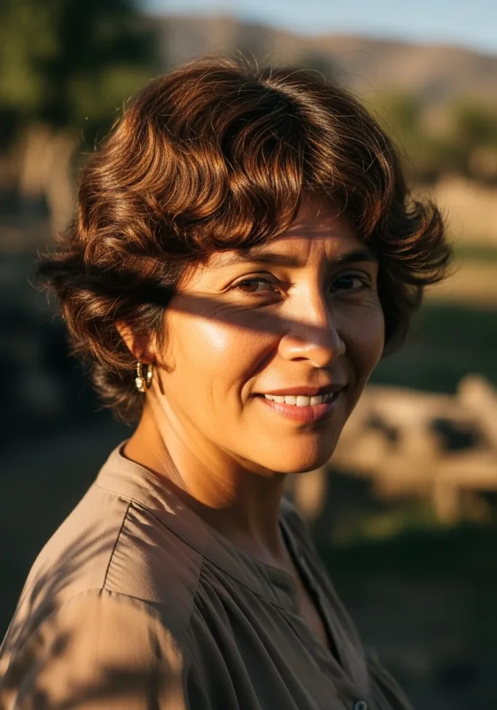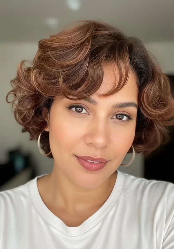 This short curly cut has soft waves that feather away from the face and create a windswept shape. The warm chestnut tone adds brightness while the loose curls sit neatly around the cheeks. The layers bring lightness and make the texture feel airy.