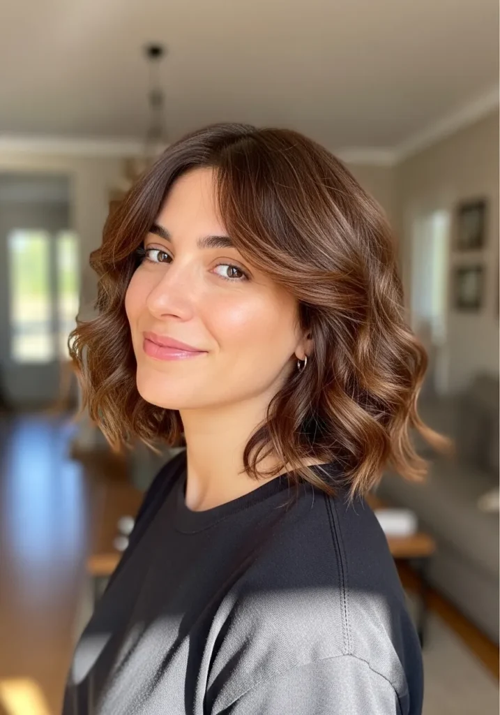 This wavy bob sits just above the shoulders with soft feathered pieces that add a little extra movement. The layers are subtle but they make the waves fall in a light and breezy way. The warm brown color catches the sunlight beautifully and the face framing pieces soften the look without taking away from the natural texture.
