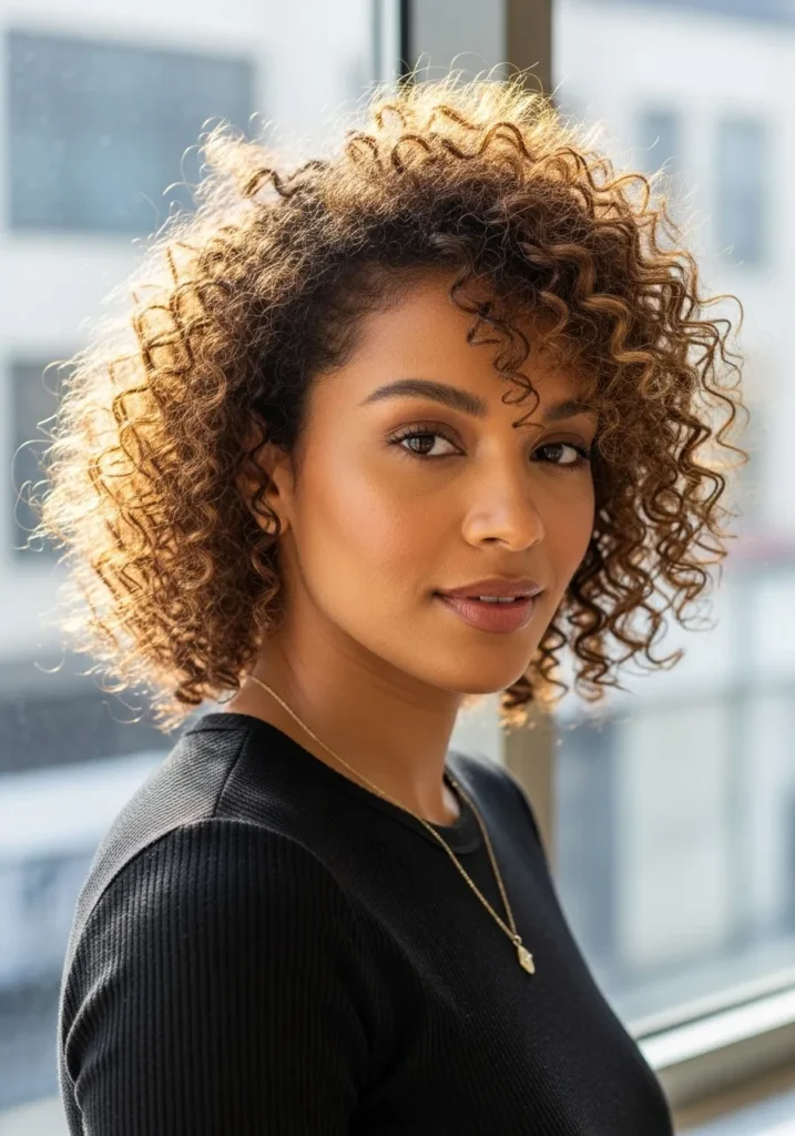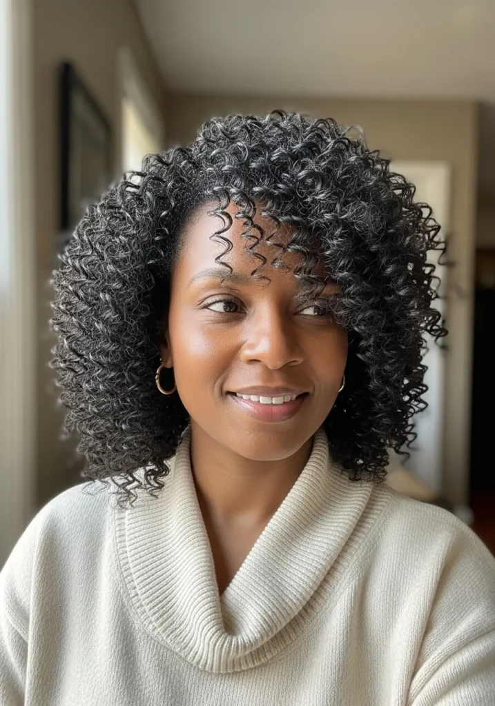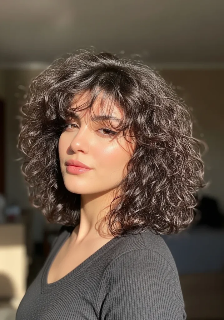 I adore cuts like this because they bring out so much personality. The feathering keeps the curls from feeling too heavy and the bangs add instant charm. It is a style that makes every curl feel alive.