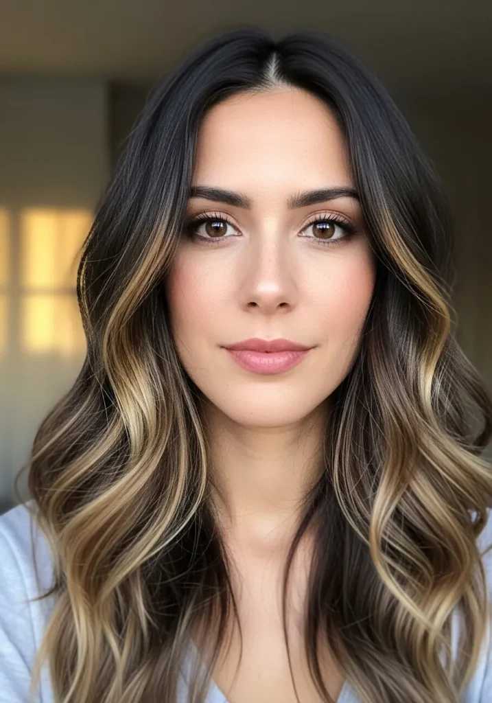 This long style has loose waves with feathered pieces around the face and soft curly ends. The blend of dark brown and honey blonde highlights adds dimension. The middle part keeps the look simple while the texture brings the perfect mix of smooth and curly.