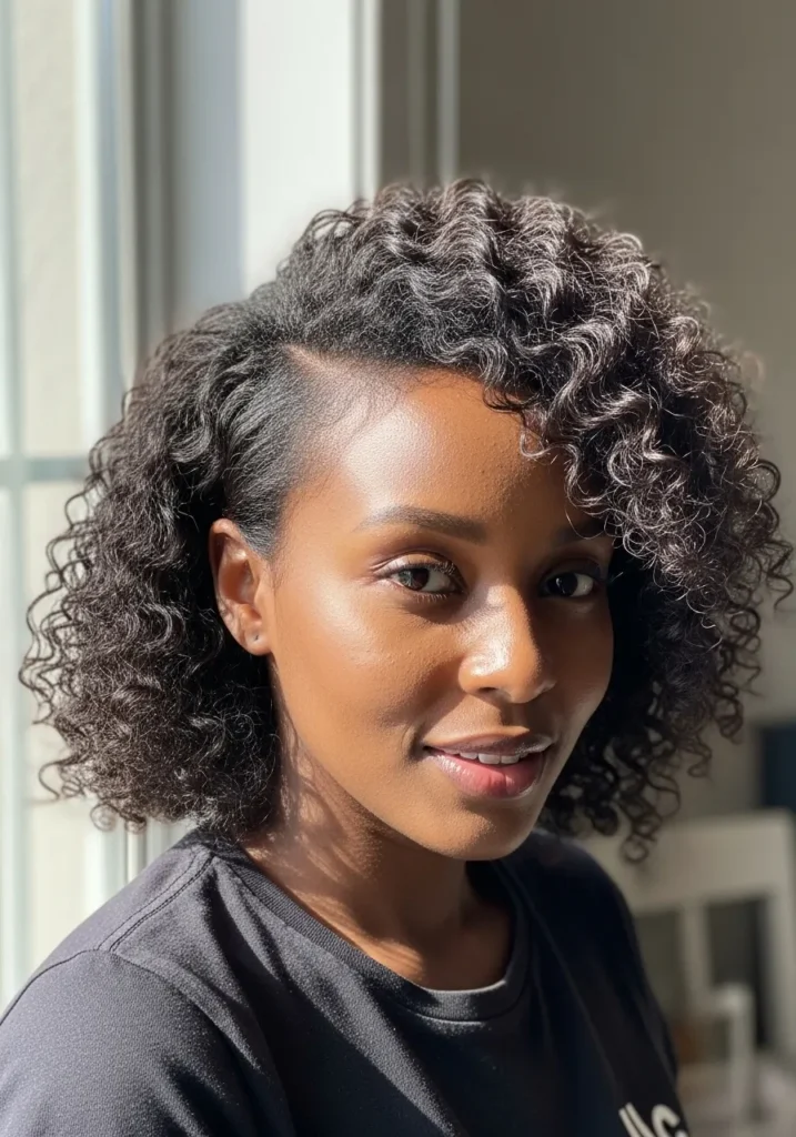 I love how a side sweep like this instantly gives the curls extra attitude. It has that easy movement that makes the whole style feel light. It is one of those cuts that looks great from every angle without needing a lot of fuss.