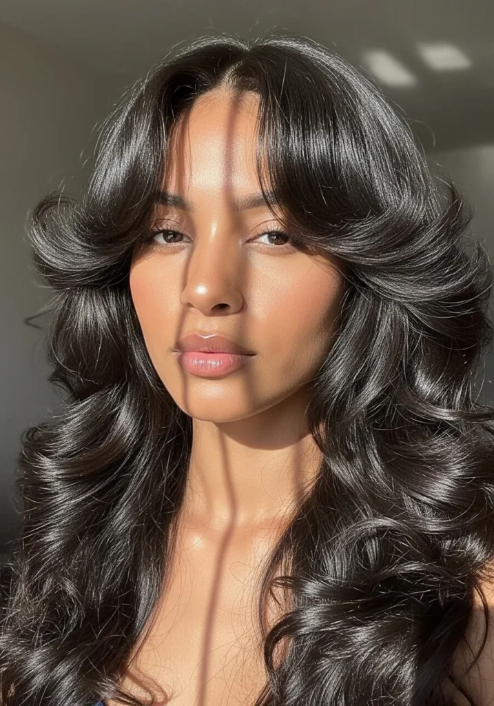 This long curly style is full of big feathered layers that make the curls look weightless and glossy. The hair falls well past the shoulders with smooth volume that frames the face in a glamorous way. The rich black color adds extra shine and the soft curtain shape at the front gives the curls a gentle, flattering lift.