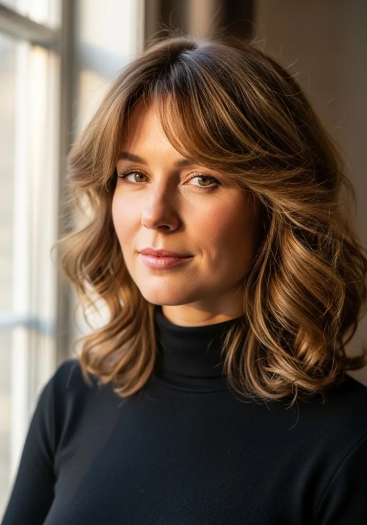 This medium length curly style blends loose curls with fluffy feathered layers that create a rounded and effortless shape. The warm honey brown color gives the curls a sunlit glow while the curtain style fringe opens up the face in the prettiest way. Everything feels soft, airy, and naturally textured.