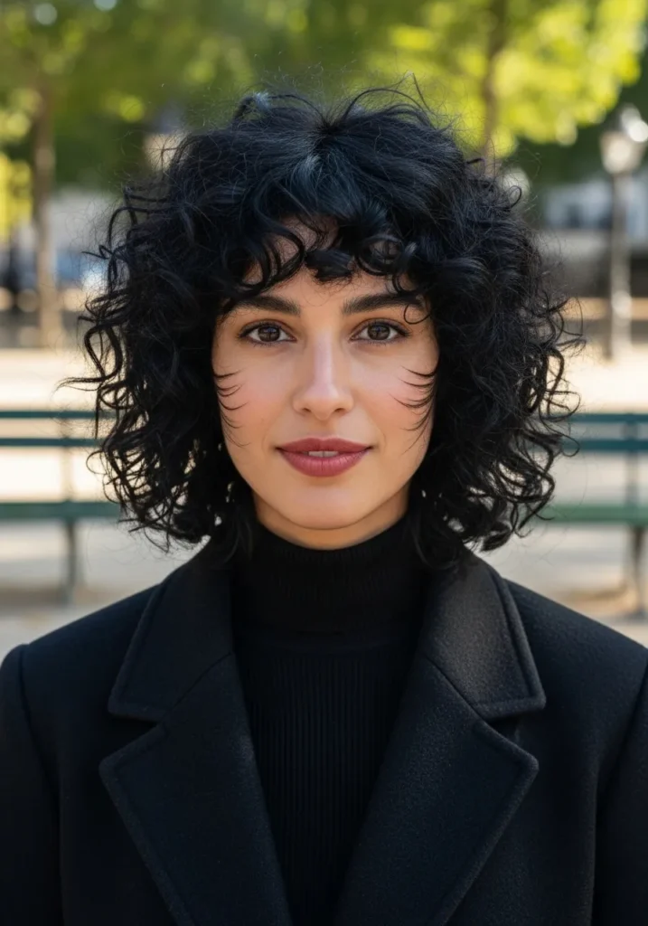These short curls are shaped into a modern curly shag with wispy feathered ends. The texture is bouncy and defined with soft volume around the cheeks. The deep black shade adds richness while the fluffy bangs make the style feel fun and expressive.