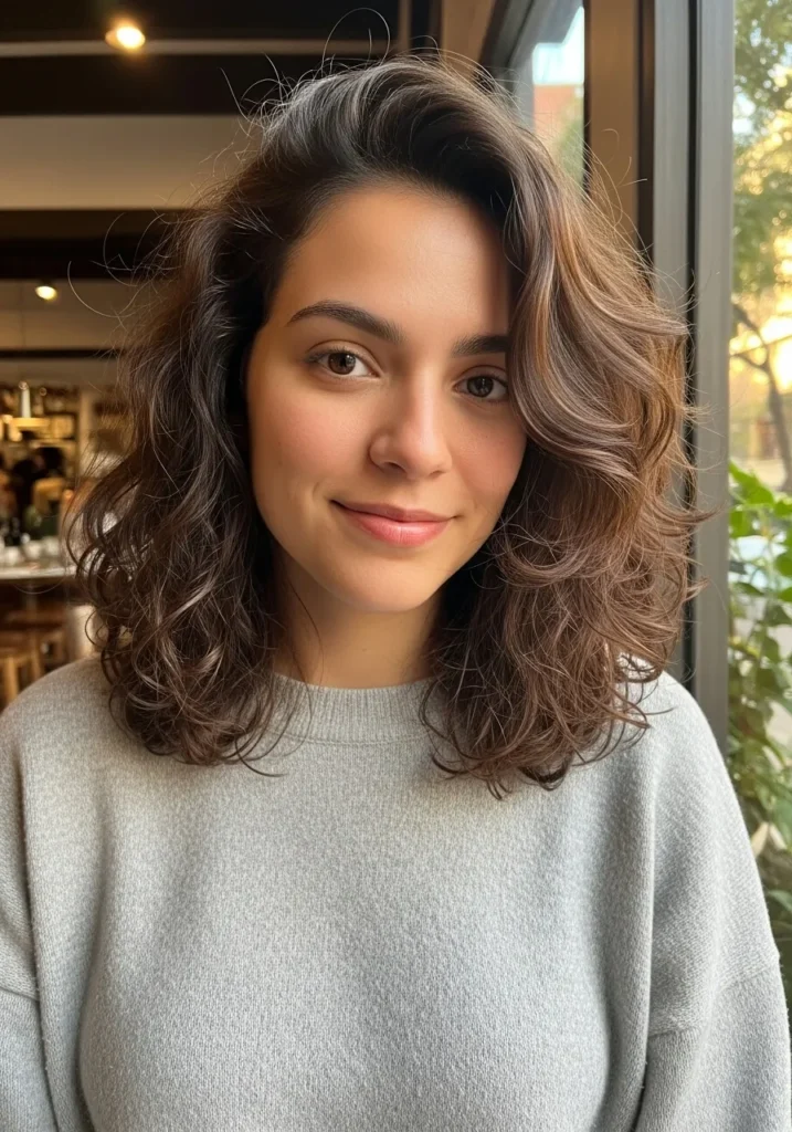 This medium curly style has loose curls with soft feathered layers that frame the face like gentle curtain pieces. The curls hit just past the shoulders with warm brunette depth and subtle shine. The middle part keeps the look relaxed and even.