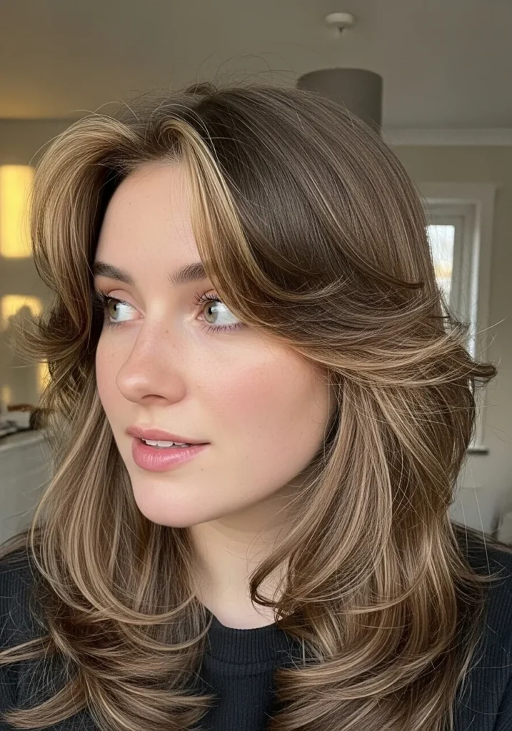 This haircut blends medium length layers with feathery tips and soft volume through the crown. Warm caramel pieces brighten the front and slide through the darker base creating a natural sweep around the cheeks. The texture is loose and touchable which gives the whole style a lifted shape.