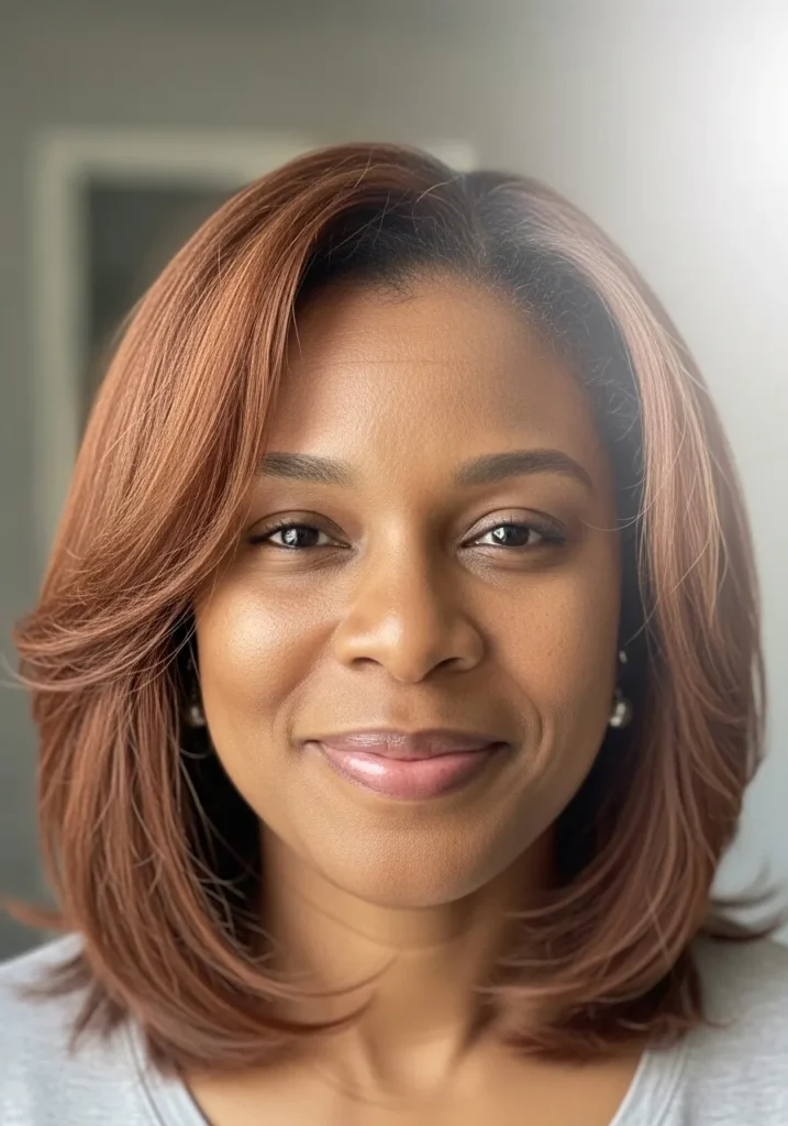 This cut sits at a long bob length with smooth layers that swing softly around the face. The feathery ends create a gentle curve that adds movement without looking heavy. The warm copper shade gives the style a rich glow that makes the texture even prettier.