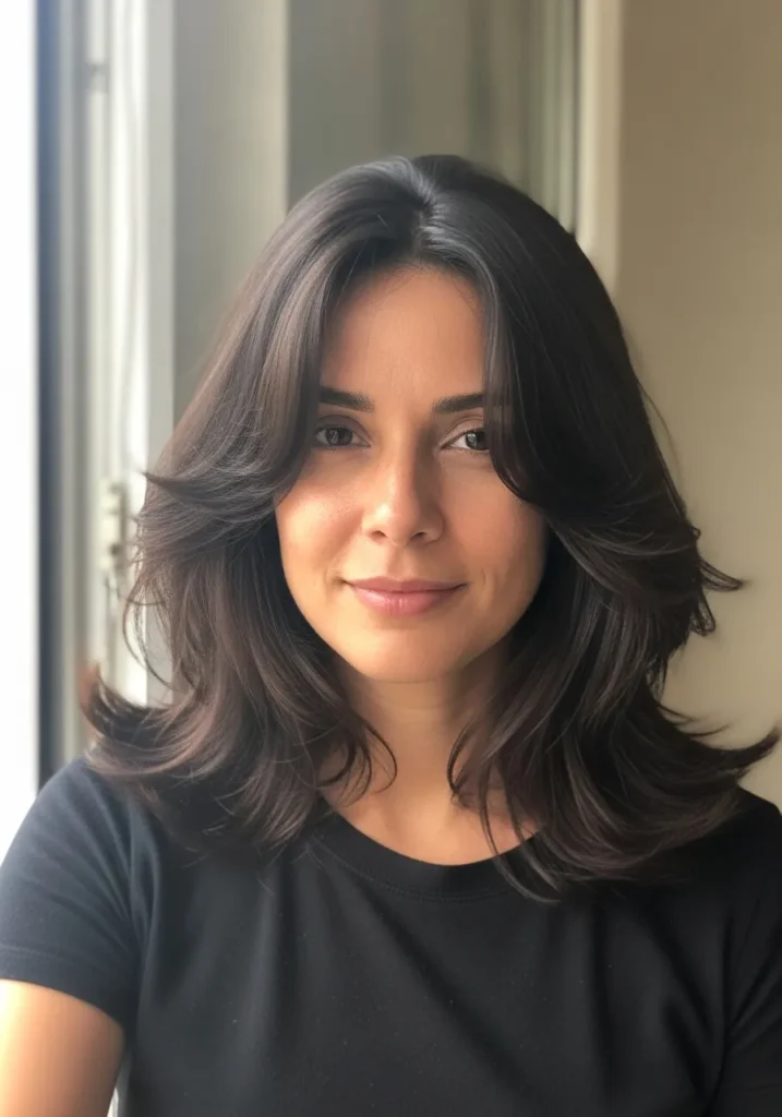 This medium length cut has soft layers that fall loosely around the face. The texture is natural and slightly wavy which lets the feathering feel easy and undone. The rich brown shade keeps the look warm and low key.