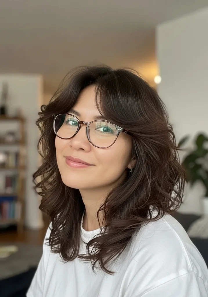 This look has medium length wavy layers paired with curtain style bangs that blend smoothly into the rest of the hair. The deep brown shade gives it a rich base while the feathering softens each wave. The texture feels relaxed and natural, perfect for someone who loves a tousled finish.