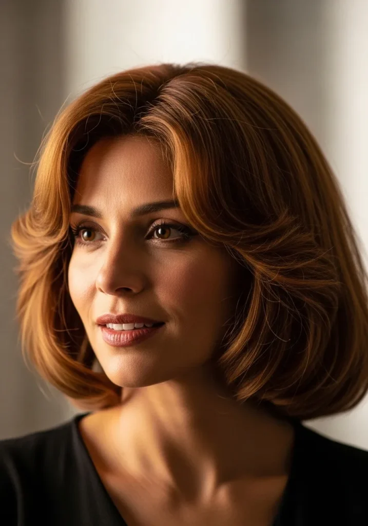 This look features a mid length shape with full feathered layers that curl softly at the ends. The copper brown shade gives the whole style warmth, and the waves sit in smooth curves that feel classic and full. The feathering lifts the shape and adds a sweet retro touch.