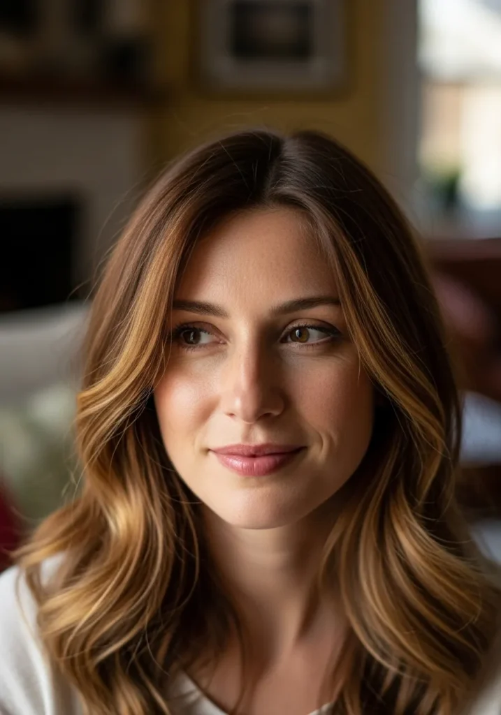 This style sits at a medium length with smooth wavy texture and light feathered layers that float around the face. The warm brown shade has soft caramel ribbons that catch the light and give the whole look a gentle glow. The layers create airy movement while keeping the shape relaxed and natural.