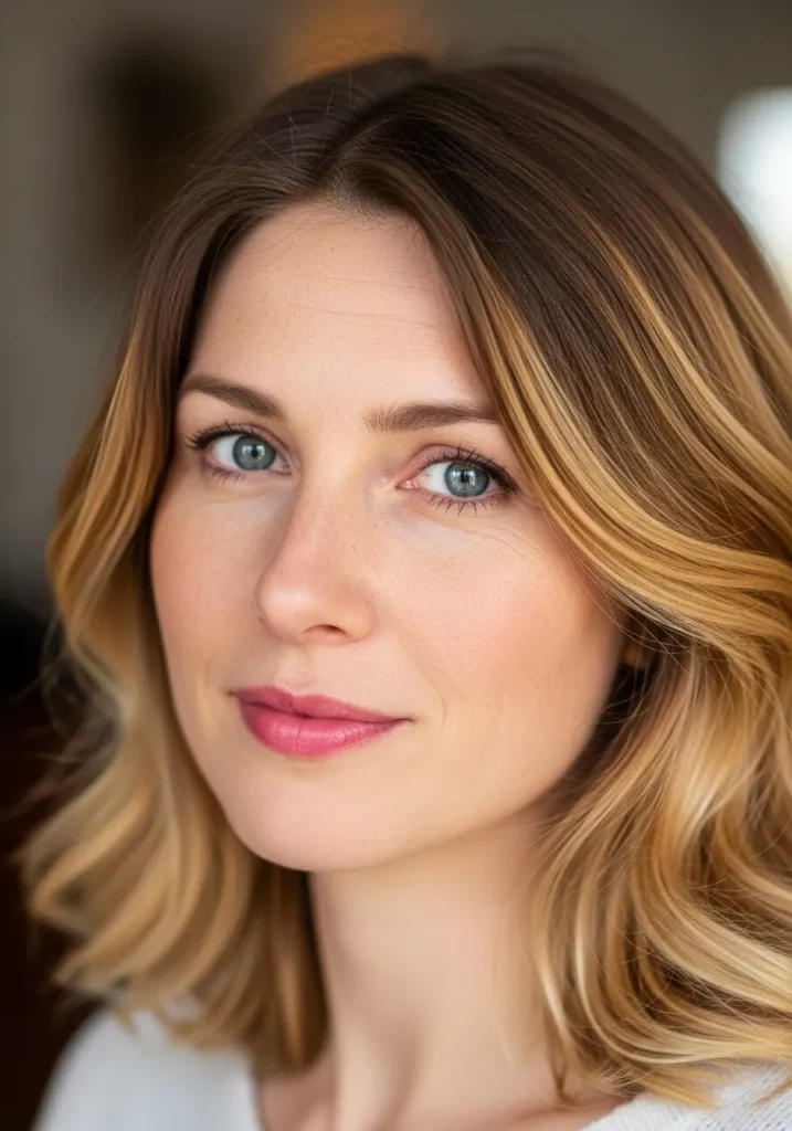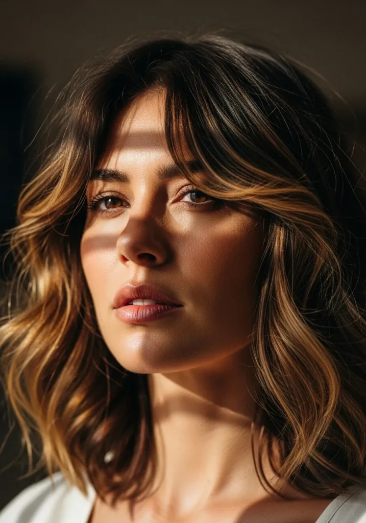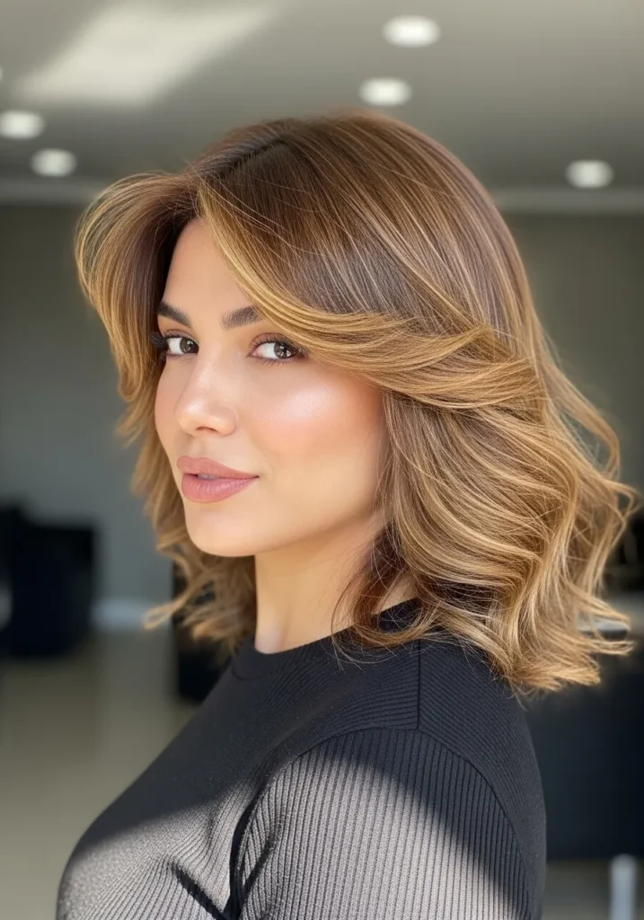 This cut uses medium length waves styled with lots of feathered layers to create airy movement. The color mixes warm brown and golden notes that brighten the shape while keeping it rich. The waves fall in a full but soft pattern that still feels controlled.