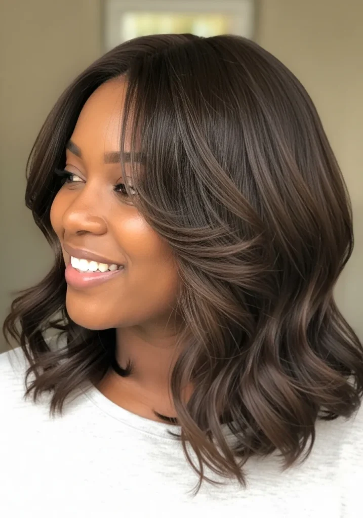 This hairstyle has a mid length wavy bob with subtle feathering through the front and soft highlights that warm up the rich brown base. The waves have an undone feel that still looks polished, and the feathering keeps the shape airy.