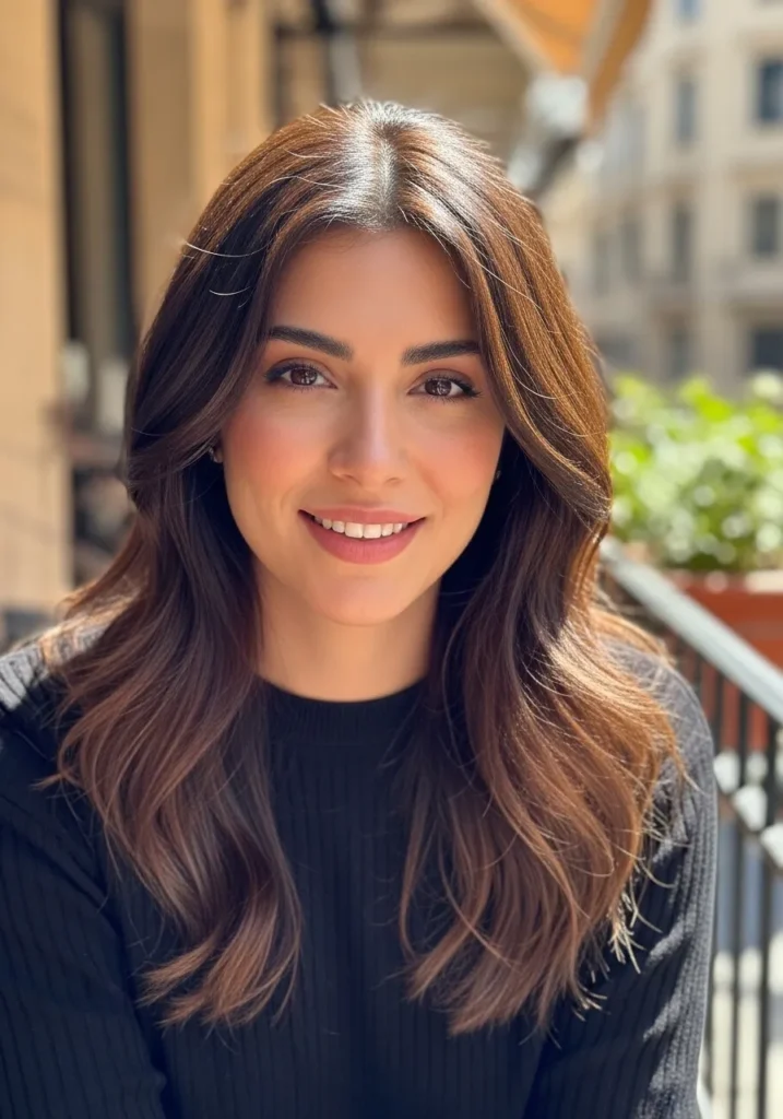 This style features long wavy layers with bold feathering that sweeps back from the face. The warm brunette base is lifted with soft honey highlights that glow in the sunlight. The waves fall in smooth, airy curves that show off the feathering beautifully, giving the whole look a fresh and lifted shape.