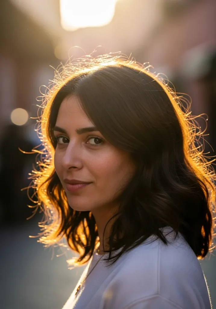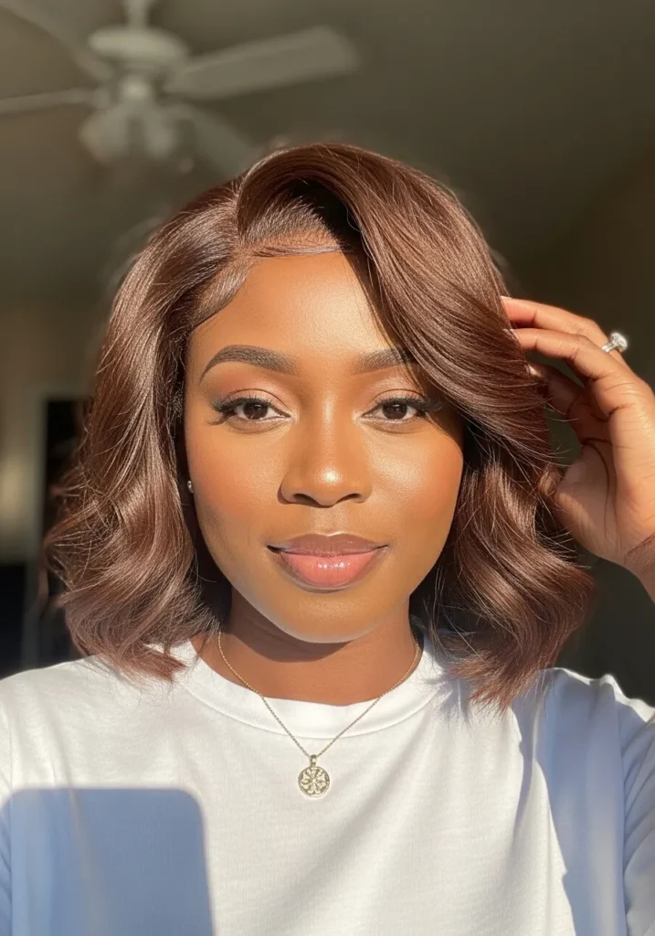 This look has a shorter wavy length with feathered layers that sit lightly around the face. The rich brown color looks soft in the warm backlight, and the waves fall in smooth, relaxed curves that keep the whole style calm and polished.