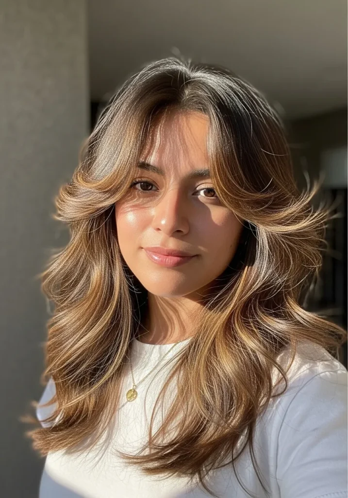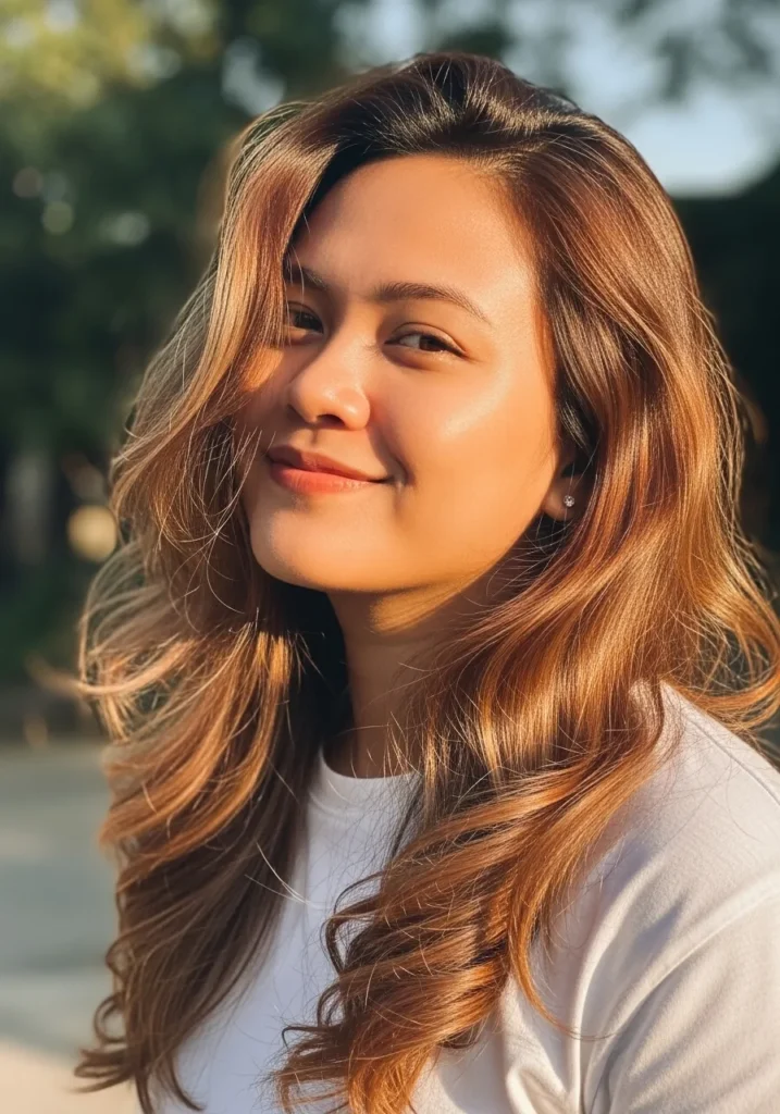 This style features long waves with feathered ends that catch the sunlight beautifully. The warm golden brown shade makes the texture feel even softer, and the layering adds light volume without making the hair too big. The waves fall in loose curves that feel natural and bright.
