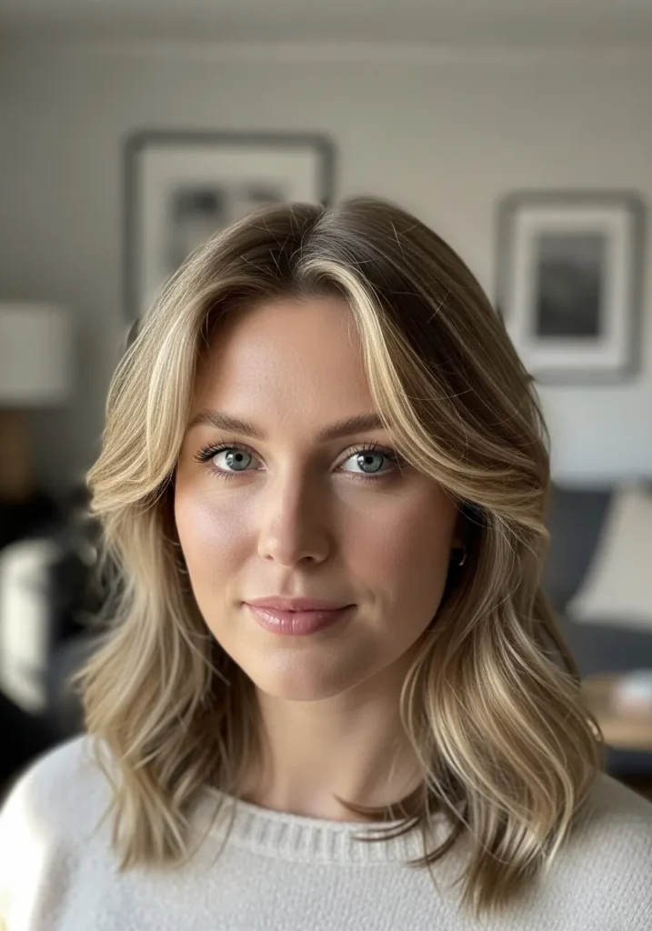 This look features medium length waves with subtle feathered layers that make the texture airy and bright. The blonde shade blends golden and beige tones that open up the face. The waves stay soft, loose, and natural without feeling heavy.