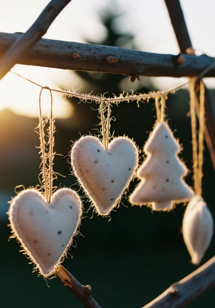 This felt garland feels like pure winter magic. Soft neutral hearts and a tiny Christmas tree hang from rustic twine, glowing gently in the golden evening light. The frayed edges and imperfect stitches make it feel so personal, like something you’d pass down through generations.