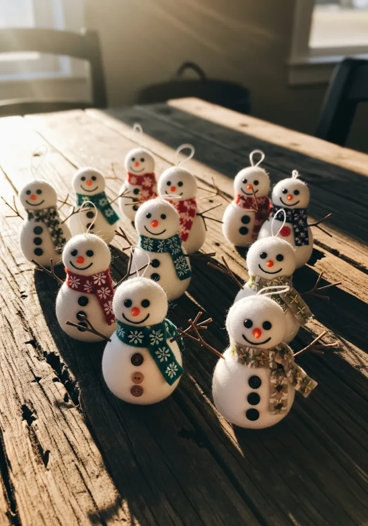 These little snowmen look ready to march right into Christmas joy. Each one has a bright scarf, button details, and the happiest little smiles. The sunlight catching their felt faces makes them seem almost alive, while the rustic wooden table adds the perfect backdrop for their cozy charm.