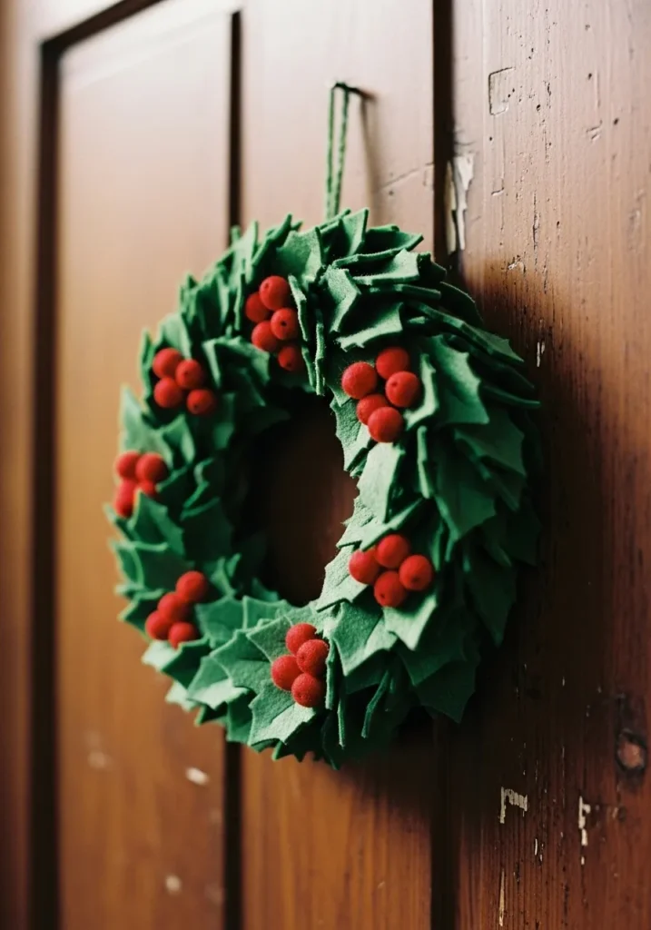 This felt wreath is such a timeless Christmas piece. The deep green layers of felt holly leaves pair perfectly with clusters of bright red berries, creating that iconic holiday look we all love. Hanging against the wooden door, it feels traditional but still fresh and welcoming.