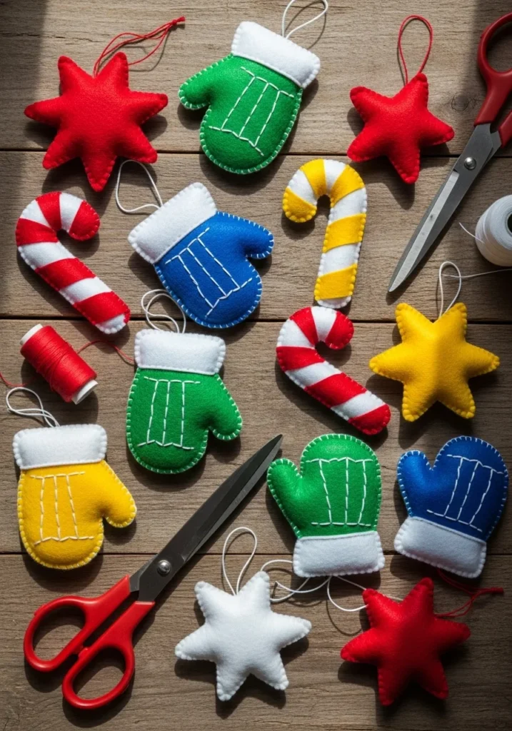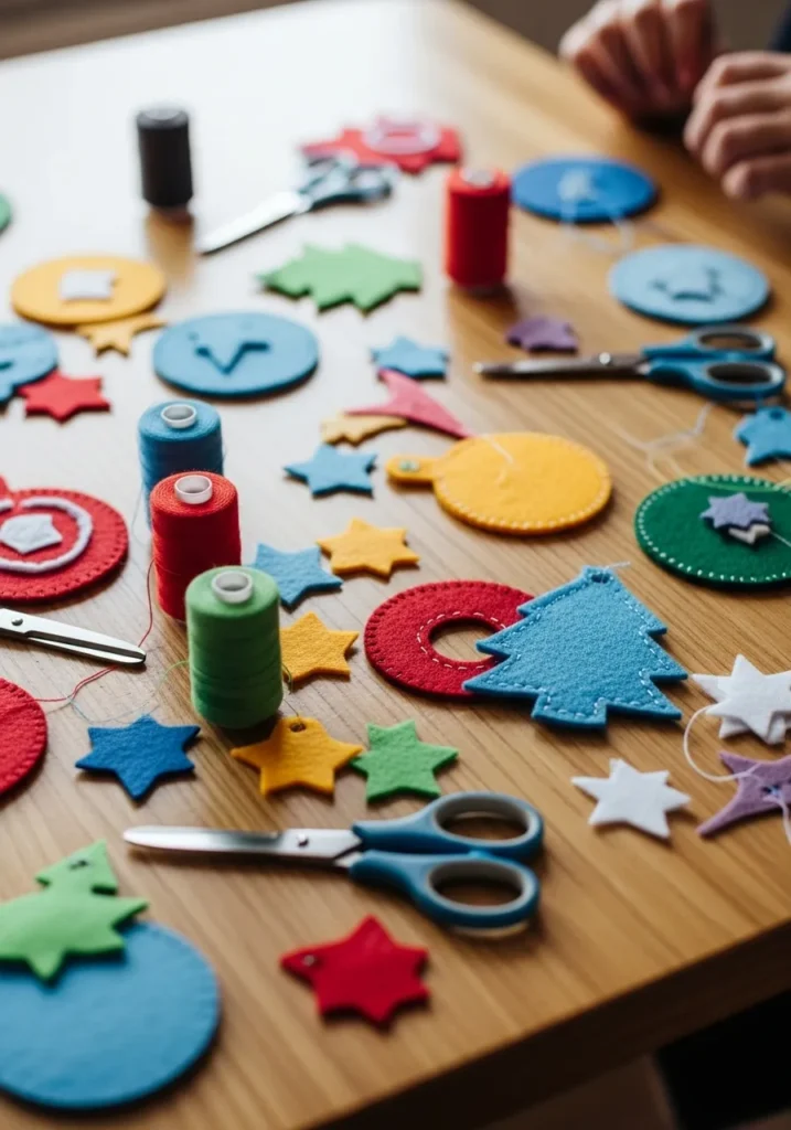 This table full of colorful felt cutouts is pure crafting happiness. Reds, blues, greens, and yellows pop against the wood surface, surrounded by spools of thread and scissors mid-project. Every piece looks ready to become a cheerful ornament or a gift topper.