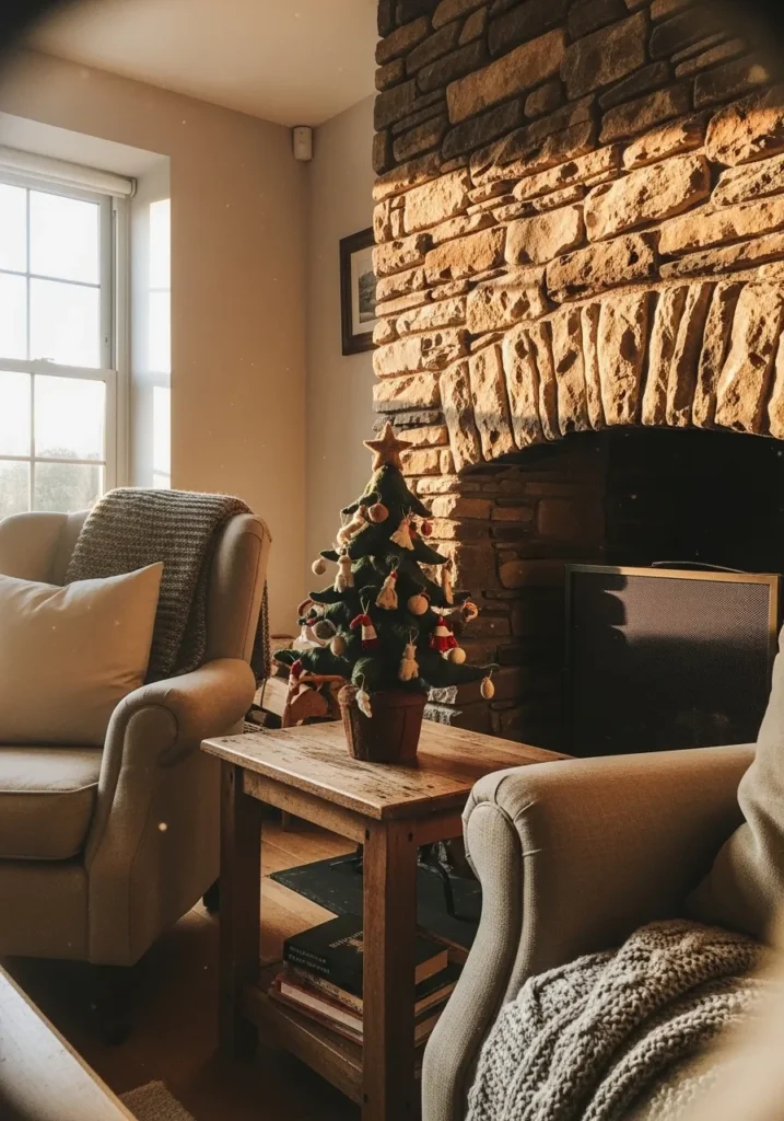 This little living room corner looks like something straight out of a Christmas postcard. The felt mini tree sits proudly on a rustic wooden table beside the fireplace, dressed in tiny handmade ornaments and topped with a soft star. The golden light from the window makes everything glow in the warmest way.