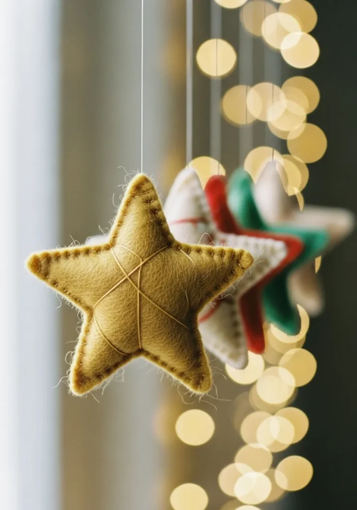 These soft felt stars look like they’re floating in a dreamy blur of Christmas lights. The golden yellow star in front steals the spotlight, with tiny stitches and fuzzy edges that make it feel extra cozy and handmade. The mix of muted holiday colors in the background gives the whole scene that warm, magical glow that’s impossible not to love.
