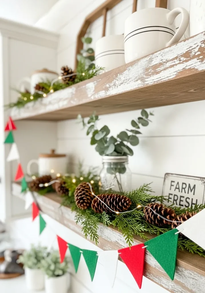 This rustic farmhouse shelf looks so festive and fresh. A simple felt banner in red, green, and white drapes gracefully beneath pinecones, greenery, and twinkling fairy lights. The mix of natural and handmade textures gives it that perfect cozy farmhouse vibe without feeling cluttered.