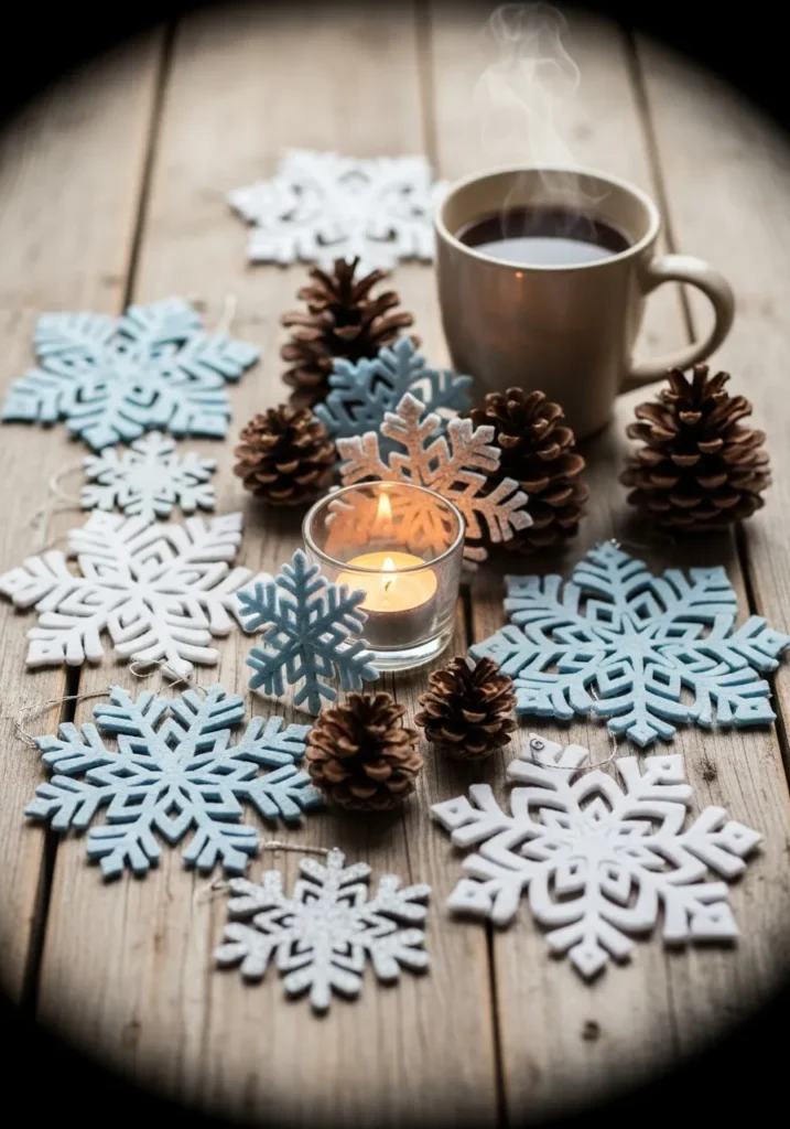 This cozy tabletop setup feels like a winter day in the best way. Pale blue and white felt snowflakes are scattered across rustic wood, surrounded by pinecones, a candle, and a steaming mug. The mix of textures—soft felt, rough wood, and glowing light—creates such a comforting balance.