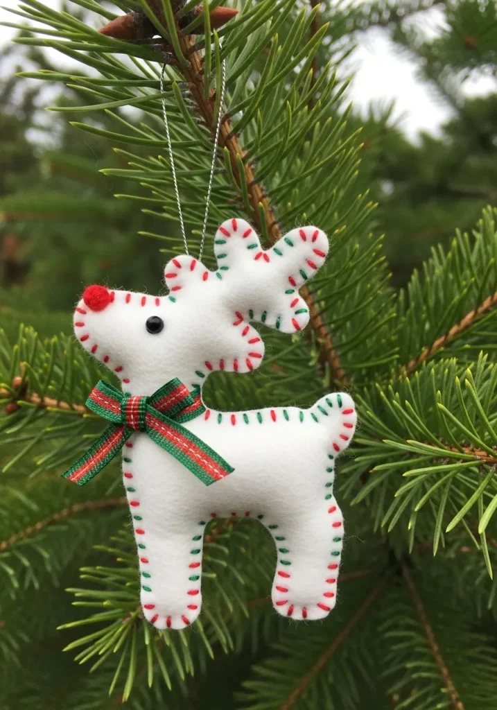 This little reindeer couldn’t be more charming with its stitched details, button eyes, and a perfect plaid bow. The red and green thread adds that classic Christmas pop against the white felt, and the fresh pine needles behind it make the whole scene smell festive just by looking at it.