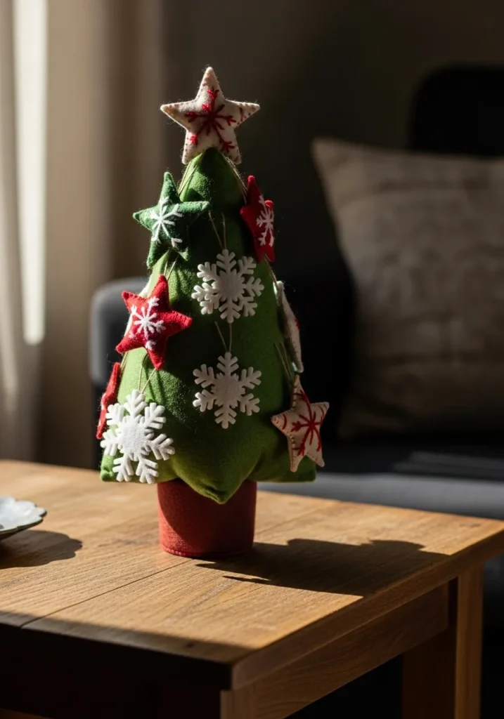 This little felt Christmas tree is the definition of handmade charm. It’s covered in red and green stars, white snowflakes, and topped with a stitched star that steals the show. The sunlight hitting the soft felt gives it such a cozy, inviting glow, perfect for a coffee table or windowsill.