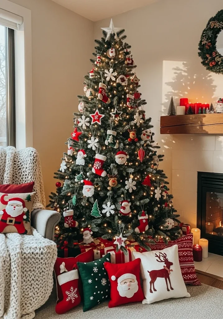 This full Christmas tree feels like a warm hug. It’s covered in handmade felt ornaments—snowflakes, Santas, stars, and stockings—all stitched in red, white, and green. The matching pillows and cozy throw tie the whole look together, creating that picture-perfect holiday corner.