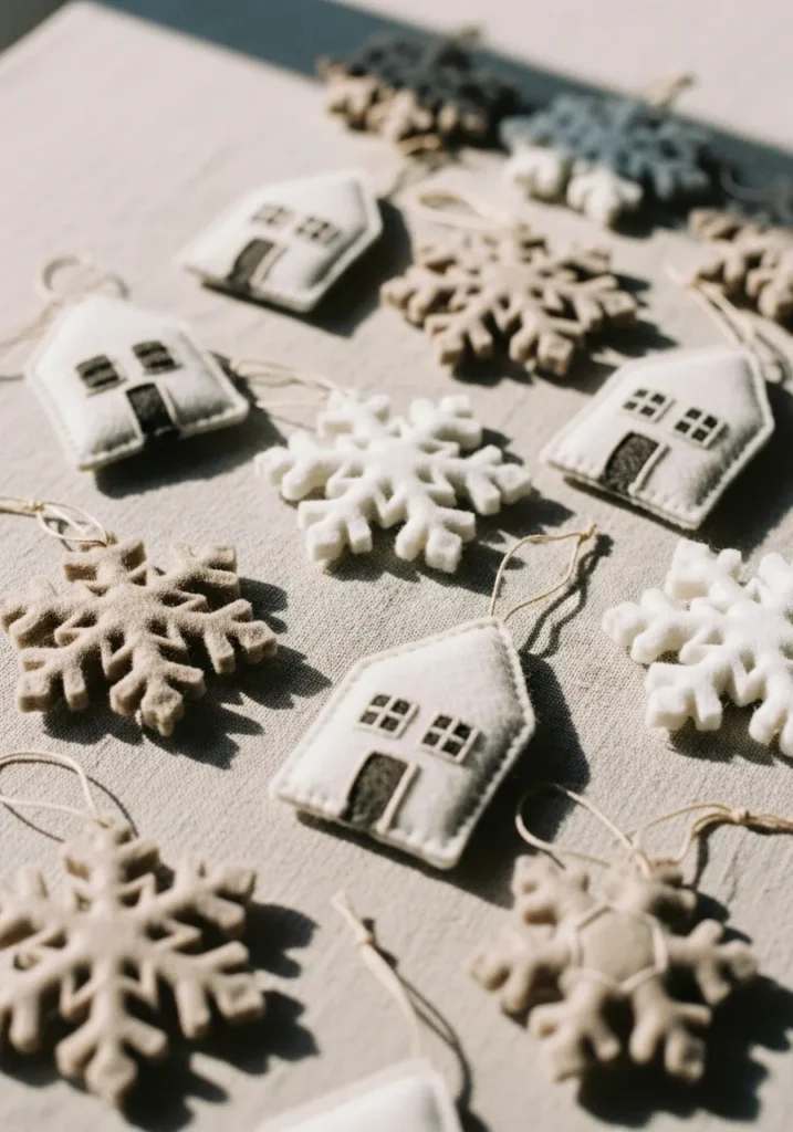These neutral felt ornaments have such a calm, Scandinavian feel. Tiny stitched houses and snowflakes in shades of white, beige, and gray create a soft, cozy palette that’s timeless and elegant. The sunlight brings out every bit of texture in the felt, making them look like little works of art.