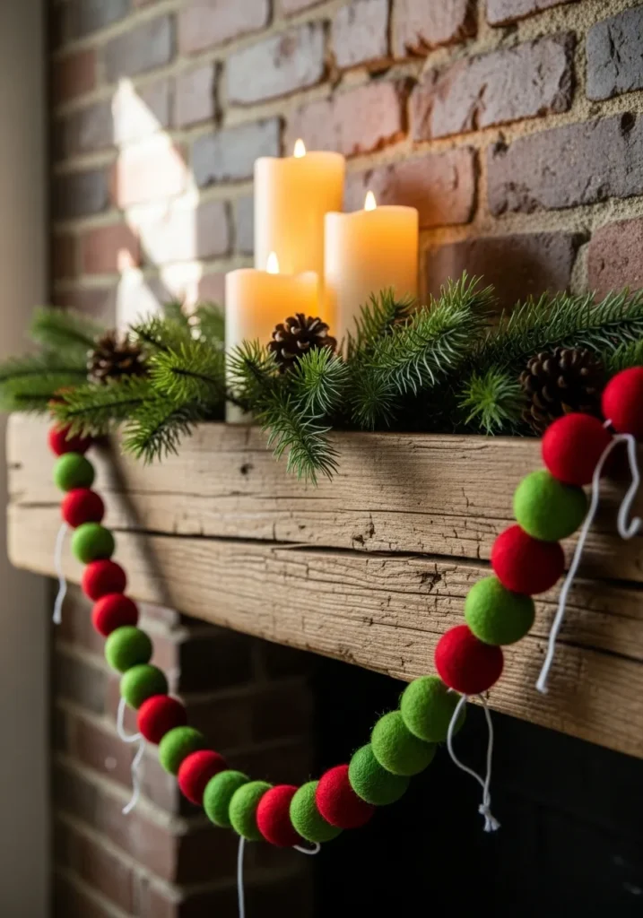 This fireplace mantel looks like a cozy cabin dream. A garland of red and green felt balls drapes across the weathered wood, surrounded by pine branches, pinecones, and glowing candles. The brick wall behind adds that perfect touch of rustic texture.