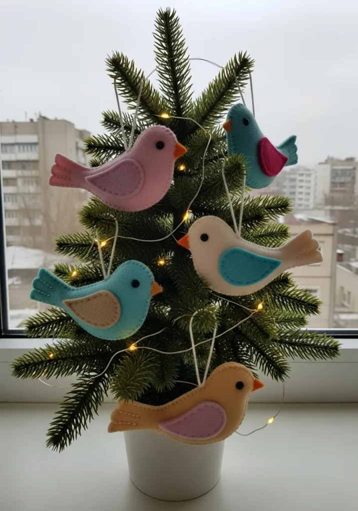 I think this setup is so sweet because it mixes handmade charm with that cozy, city-apartment feel. The felt birds give the tree a playful touch without being over the top, and it reminds me how a few crafty details can turn even the smallest corner into a pocket of joy.